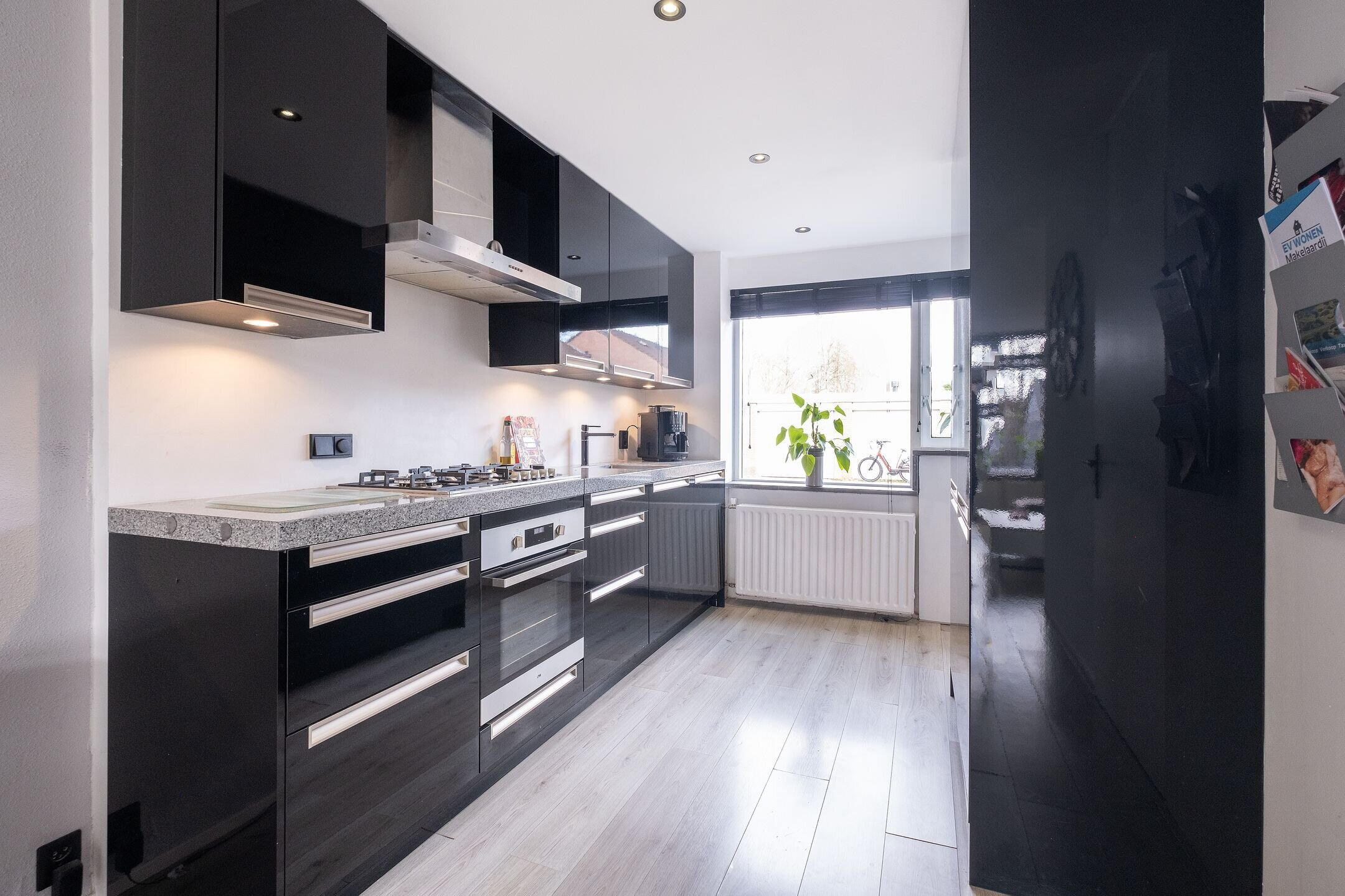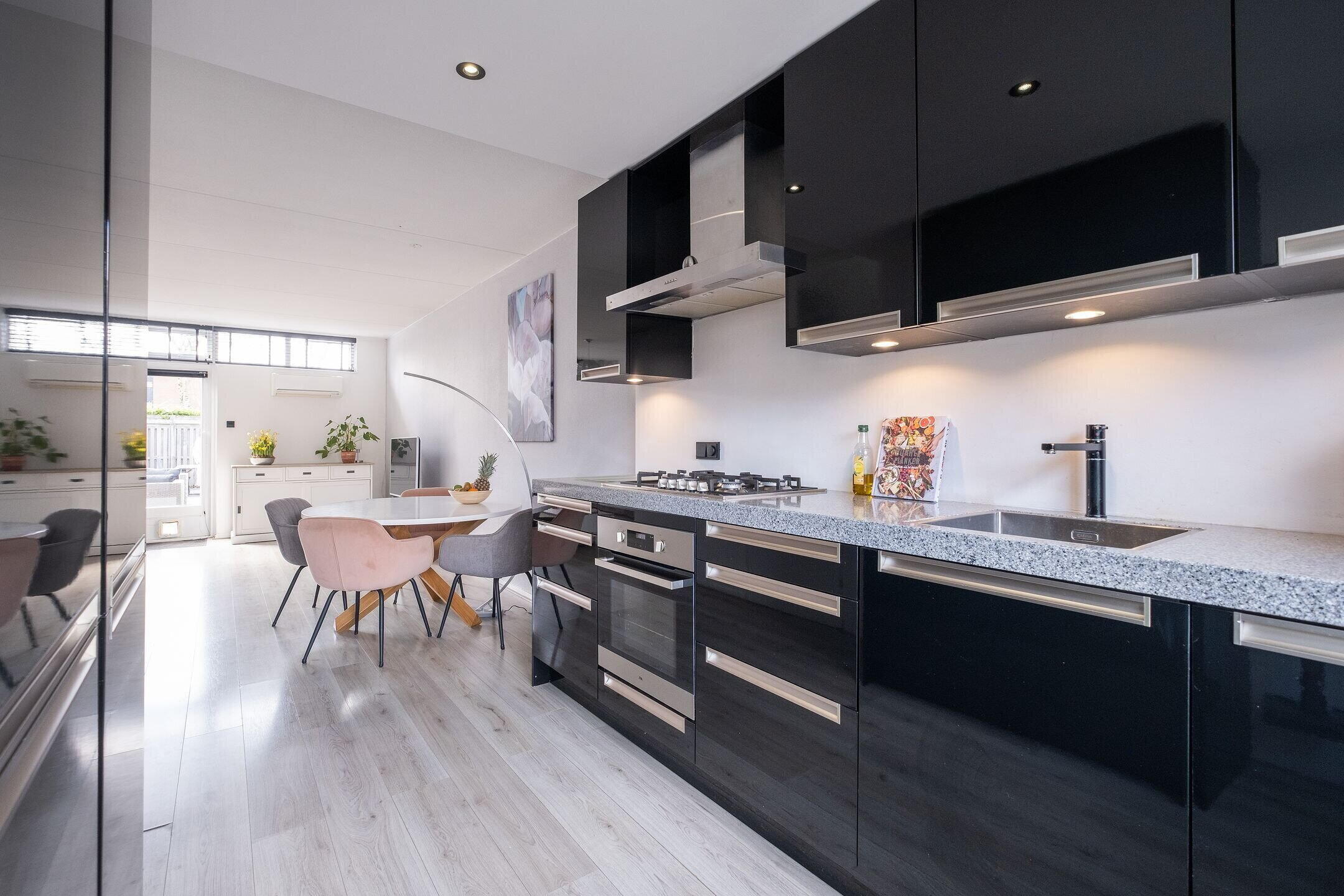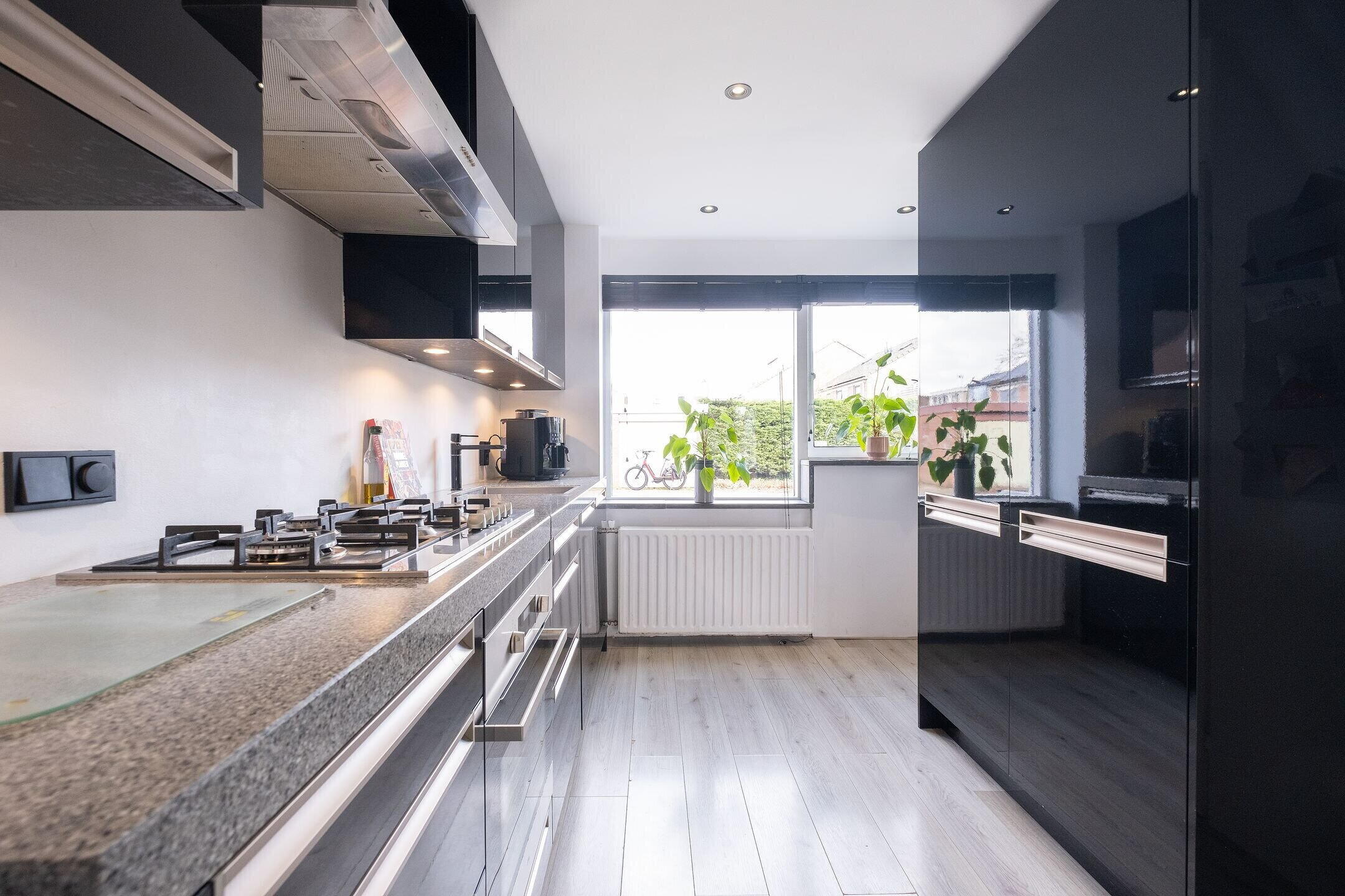 De open keuken is modern uitgevoerd en voorzien van een granieten werkblad en diverse inbouwapparatuur, waaronder een 5-pits gaskookplaat, oven, magnetron, koelkast, vriezer (3 laden), vaatwasser, afzuigkap en een RVS spoelbak.