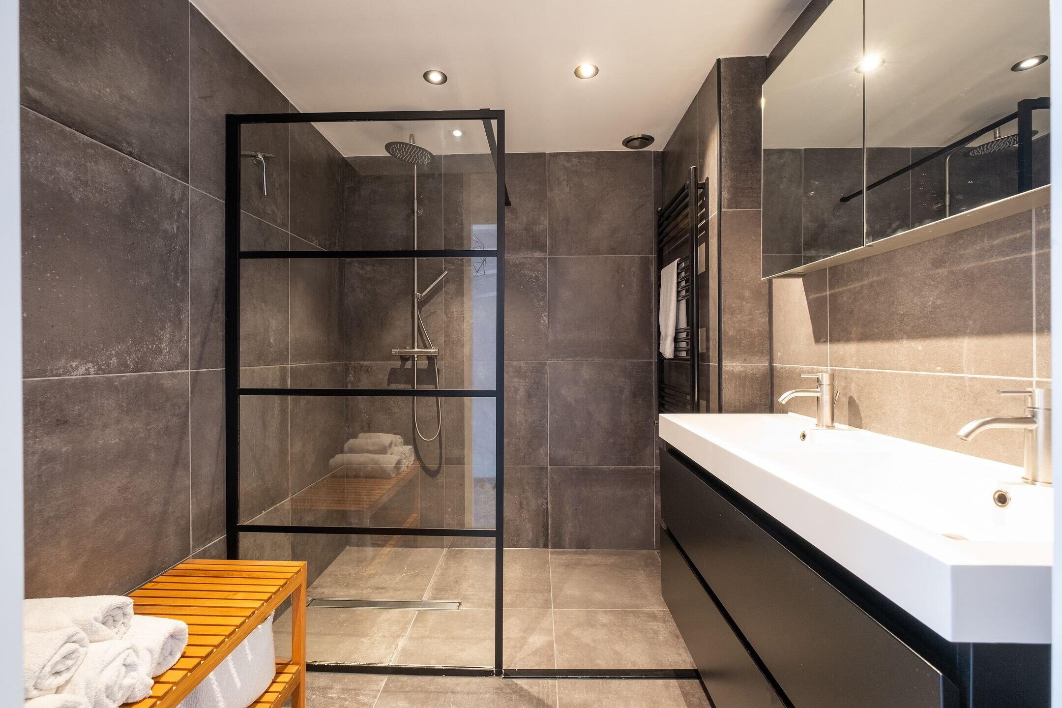 De badkamer is modern ingericht en voorzien van een inloopdouche, dubbele wastafel, designradiator, vloerverwarming en spotverlichting.