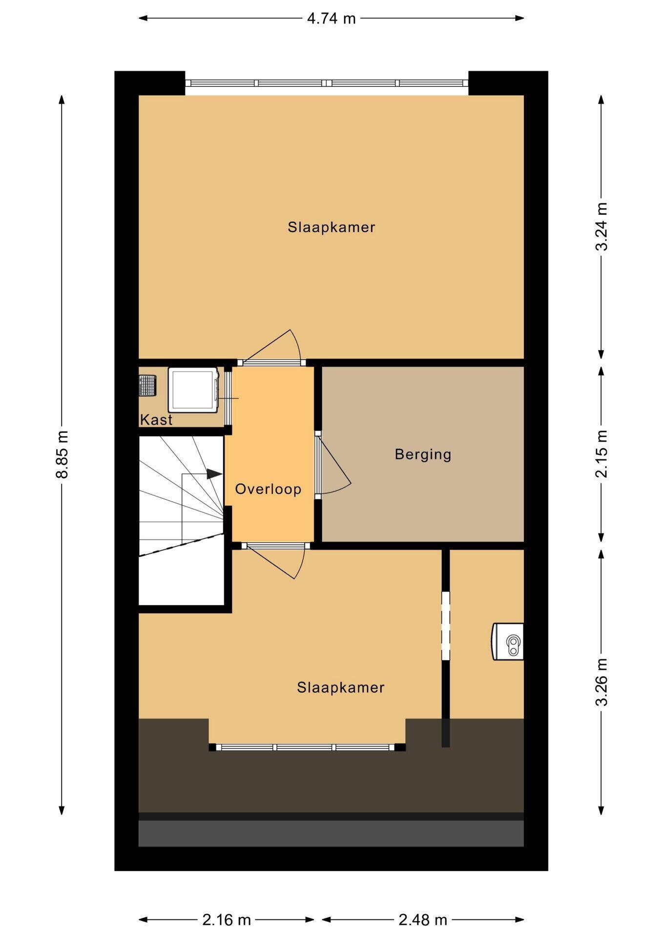 Op de overloop vind je een kast met aansluitingen voor wasmachine en droger of extra bergruimte. Daarnaast is er op de overloop nog een royale bergkamer/ruimte aanwezig, die ook uitstekend is in te richten als inloopkast.